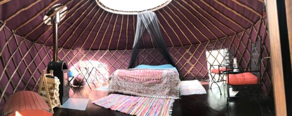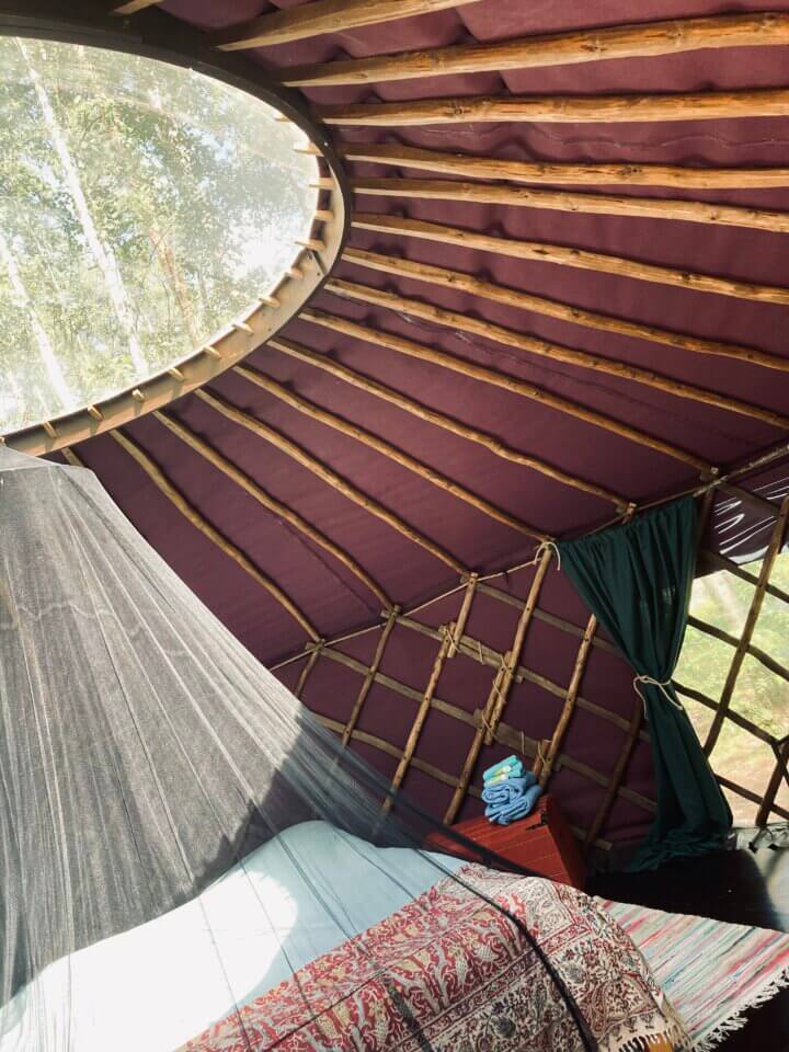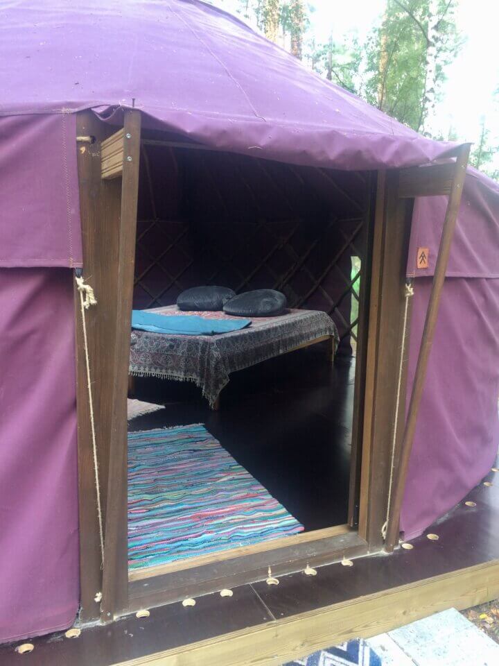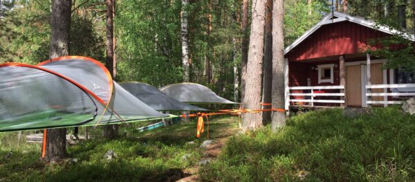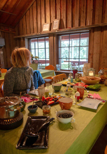 Aamiaisella myllytuvassa.Tentsile-teltat ja Rantala-mökki.